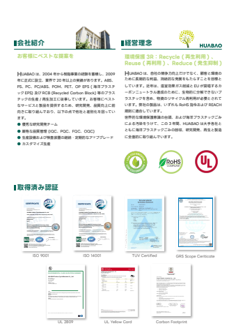 %u53d6%u5f97%u6e08%u307f%u8a8d%u8a3cTUV Certified Carbon FootprintISO 9001UL 2809ISO 14001 GRS Scope CeriticateThe Governing Board of ARES International Certification Co., Ltd.Hereby Grants To:HUABAO Carbon Cycle Materials Co., LtdNo.99, Huanxi Rd., Guanyin Dist., Taoyuan City, 328, TaiwanHas been assessed and found to be in accordance with the requirements of standard detailed belowISO 9001:2015 IAF CodeQ14-1ScopePlastic Composite Material Processing, Plastic Granulation Dyeing Processing and Recycled Plastic Re-Granulation ProcessingCertificate No.: ARES/TW/I2212125Q Certificate Renewal Date: 2025-05-22Certificate Issue Date: 2022-12-27 Registration Expiration Date: 2025-12-26The time interval between each surveillance audit and the last on-site audit shall not exceed 12 months, and the organization must obtain %u201csurveillance audit approval notification%u201d issued by ARES to ensure the validity of the certificate.The Governing Board of ARES International Certification Co., Ltd.Hereby Grants To:HUABAO Carbon Cycle Materials Co., LtdNo.99, Huanxi Rd., Guanyin Dist., Taoyuan City, 328, TaiwanHas been assessed and found to be in accordance with the requirements of standard detailed belowISO 14001:2015 IAF CodeE14-1ScopePlastic Composite Material Processing, Plastic Granulation Dyeing Processing and Recycled Plastic Re-Granulation ProcessingCertificate No.: ARES/TW/I2212125E Certificate Renewal Date: 2025-05-22Certificate Issue Date: 2022-12-27 Registration Expiration Date: 2025-12-26The time interval between each surveillance audit and the last on-site audit shall not exceed 12 months, and the organization must obtain %u201csurveillance audit approval notification%u201d issued by ARES to ensure the validity of the certificate.TAIWAN IDFL LABORATORY AND INSTITUTE LIMITED8F., No. 312, Sec. 2, New Taipei Blvd., Xinzhuang Dist., New Taipei City 242032 TaiwanSCOPE CERTIFICATE Scope Certificate Number: IDF-24-644754Scope Certificate Version Number: 2IDFLcertifies thatHUABAO CARBON CYCLE MATERIALS CO., LTD.%u83ef%u5bf6%u78b3%u5faa%u74b0%u6750%u6599%u80a1%u4efd%u6709%u9650%u516c%u53f8Textile Exchange-ID (TE-ID): TE-99972174IDFL Client Number: 008459No.99, Huanxi Rd., Guanyin Dist.,Taoyuan City, 328451Taoyuan, Taiwanhas been audited and found to be in conformity with theGlobal Recycled Standard (GRS) (Version 4.0)Products categories mentioned below (and further specified in the product appendix) conform with the standard(s):Processed Post-Consumer Materials (PC0035); Processed Pre-Consumer Materials (PC0041)Process categories carried out under responsibility of the above mentioned organization for the certified products cover:Mechanical Recycling (PR0017)This certificate is valid until: 2025-11-07Audit criteria: Global Recycled Standard V4.0; Content Claim Standard V3.1; Textile Exchange Standards Claim Policy V1.3TE-ID TE-99972174Place and Date of Issue (YYYY-MM-DD) Certification Body StandardTAIWAN IDFL LABORATORY ANDINSTITUTE LIMITED, 2024-11-08Last Updated: 2025-06-24IDFL License No: CB-IDFWilford Lieber, CEOCertification Body Licensed by: Textile Exchange (TE); Licensing Code: CB-IDFCertification Body Accredited by: TAF; Accreditation Number: PC054Inspection Body: TAIWAN IDFL LABORATORY AND INSTITUTE LIMITEDThis scope certificate provides no proof that any goods delivered by its holder are Global Recycled Standard (GRS) certified. Proof of GlobalRecycled Standard (GRS) certification of goods delivered is provided by a valid transaction certificate (TC) or equivalent covering them.The issuing body may withdraw this certificate before it expires if the declared conformity is no longer guaranteed.To authenticate this certificate, please visit www.TextileExchange.org/CertificatesThis electronically issued document is the valid original version.Scan QR Code to verify certificate. Authentic QR codes will link to URLs beginning with https://os.idfl.com otherwisecontact IDFL.UL Yellow CardENVIRONMENTAL CLAIM VALIDATION SUMMARYHUABAO Carbon Cycle Materials Co., Ltd.PCA-FR450Report Number:Validation Period:12 Jun 2024 - 29 Mar 2026Claim:Method:Facility:PCA-FR450 contains 90% recycled content, consisting of 85% post-consumer recycled content, and 5% ocean plastics.**PCA-FR450 includes all colors.Environmental Claim Validation Procedure (ECVP) for Ocean Plastics and Ocean Bound Plastics, UL ECVP 2809-3, Second Edition, dated November 7, 2023. Recycled Content is defined in accordance with ISO 14021.99 Huanxi Rd, Guanyin Dist, Taoyuan, 328, Taiwan333737-4210%u00a9 2019 UL %u2022 2211 Newmarket Parkway, Marietta, GA 30067-9399 USA %u2022 T: 888.485.4733 %u2022 F: 770.980.0072 %u2022 W: ul.com/environment%u4f1a%u793e%u7d39%u4ecb%u304a%u5ba2%u69d8%u306b%u30d9%u30b9%u30c8%u306a%u63d0%u6848%u3092HUABAO %u306f%u30012004 %u5e74%u304b%u3089%u6a39%u8102%u4e8b%u696d%u306e%u7d4c%u9a13%u3092%u84c4%u7a4d%u3057%u30012009%u5e74%u306b%u6b63%u5f0f%u306b%u8a2d%u7acb%u3001%u696d%u754c%u3067 20 %u5e74%u4ee5%u4e0a%u306e%u5b9f%u7e3e%u304c%u3042%u308a%u307e%u3059%u3002ABS%u3001PS%u3001PC%u3001PC/ABS%u3001POM%u3001PET%u3001OP EPS ( %u6d77%u6d0b%u30d7%u30e9%u30b9%u30c1%u30c3%u30af EPS) %u53ca%u3073 RCB (Recycled Carbon Black) %u7b49%u306e%u30d7%u30e9%u30b9%u30c1%u30c3%u30af%u306e%u751f%u7523 / %u518d%u751f%u52a0%u5de5%u306b%u5f93%u4e8b%u3057%u3066%u3044%u307e%u3059%u3002%u304a%u5ba2%u69d8%u306b%u30d9%u30b9%u30c8%u306a%u30b5%u30fc%u30d3%u30b9%u3068%u88fd%u54c1%u3092%u63d0%u4f9b%u3059%u308b%u305f%u3081%u3001%u7814%u7a76%u958b%u767a%u3001%u54c1%u8cea%u5411%u4e0a%u306b%u524d%u5411%u304d%u306b%u53d6%u308a%u7d44%u3093%u3067%u304a%u308a%u3001%u4ee5%u4e0b%u306e%u70b9%u3067%u4ed6%u793e%u3068%u5dee%u5225%u5316%u3092%u56f3%u3063%u3066%u3044%u307e%u3059%u3002%u25cf %u512a%u79c0%u306a%u7814%u7a76%u958b%u767a%u30c1%u30fc%u30e0%u25cf %u53b3%u683c%u306a%u54c1%u8cea%u7ba1%u7406 (IQC%u3001PQC%u3001FQC%u3001OQC)%u25cf %u751f%u7523%u8a2d%u5099%u304a%u3088%u3073%u691c%u67fb%u88c5%u7f6e%u306e%u7d99%u7d9a%u30fb%u5b9a%u671f%u7684%u306a%u30a2%u30c3%